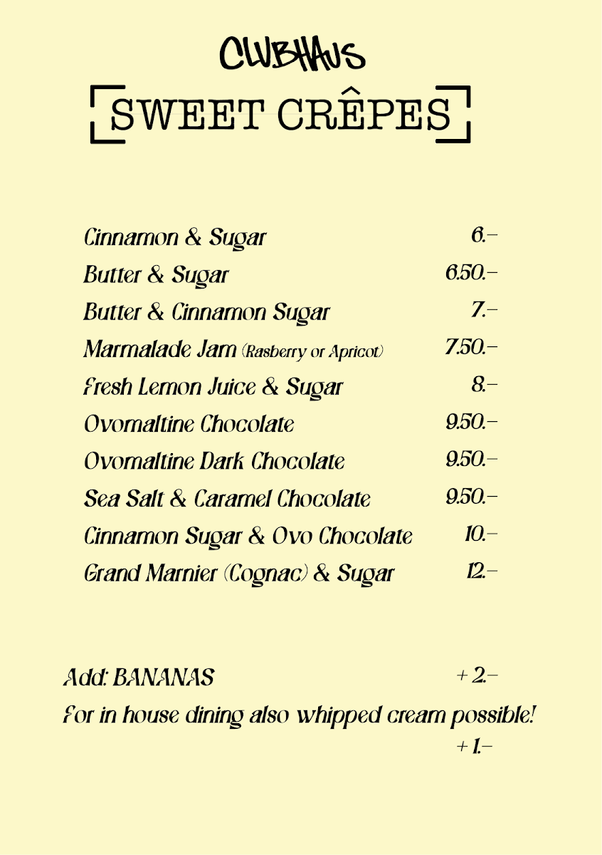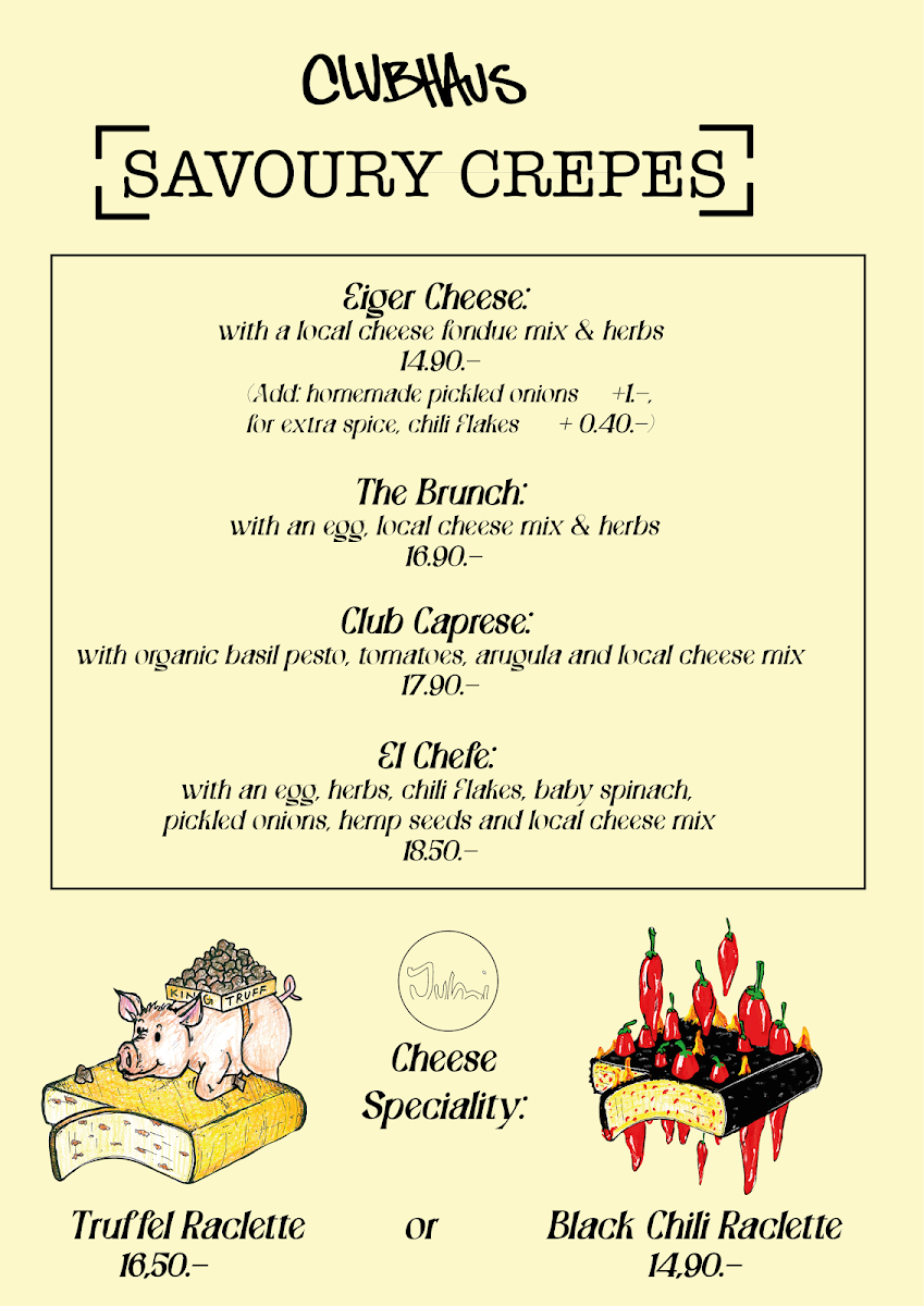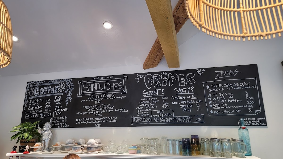 The menu at Clubhaus Café & Crêperie offers a delightful selection of sweet and savory dishes, all prepared with quality ingredients. Their Crepes are the highlight, featuring a variety of fillings that range from classic options like Nutella to more inventive choices. One standout is the Salted Chocolate Crepe, which balances rich chocolate with a touch of salt, creating a perfect dessert for those with a sweet tooth. The crêpes are light yet satisfying, making them a fantastic choice for any time of the day. For those looking for something a bit more substantial, there are savory crêpes as well, ideal for a savory lunch or dinner. All dishes are thoughtfully crafted, ensuring that every bite is as enjoyable as the last. Whether you're in the mood for a quick snack or a leisurely meal, Clubhaus Café & Crêperie has something to offer, making it a must-visit spot in Grindelwald.